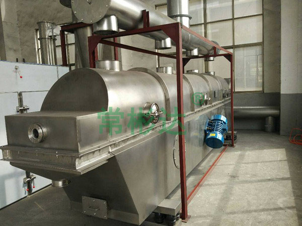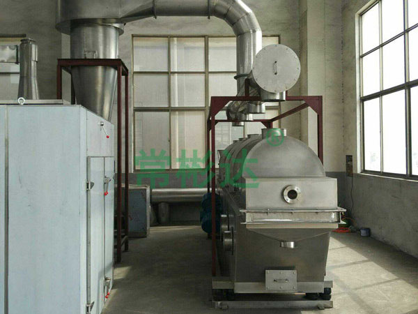 物料自進料進口進入機內(nèi),在振動力作用下,物料沿水平面流化床拋擲,向前連續(xù)運動,熱風向上穿過流化床同濕物料換熱后,濕空氣經(jīng)旋風分離器除塵后由排風1:3排出,干燥物料由排料進口排出。