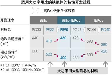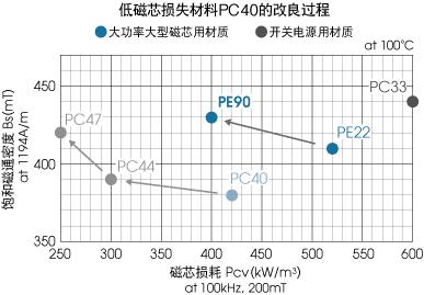 其最初的成果見上圖所示的開發過程,是為響應開關電源的最尖端需求而著手的PC40至PC47。現在,這一系列的磁芯損耗已達到大約40%以下的250kW/m3,飽和磁通密度也達到超過高飽和磁通密度材料PE22的420mT。