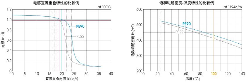 然而,新型鐵氧體的出現使以上說法成為過去。在串聯電抗器與進線電抗器設計上,重要的判斷材料是直流重疊特性。從PE22到新型鐵氧體,其實力是如何進步的呢? 以下表示其成果。