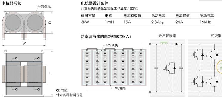 在這些系統中不可或缺的功率調節器上,配置有多個在功率轉換過程中發揮重要作用的串聯電抗器與進線電抗器,但這些器件產生的損耗快要不能忽視了。在輸出功率3kW、電感1mH、電流有效值15A、電流峰值24A、工作頻率16kHz的情況下模擬串聯電抗器與進線電抗器損耗 (逆變器平滑用),可知使用了Si高硅鋼板、鐵硅鋁磁合金的串聯電抗器與進線電抗器的損耗 (鐵損+銅損) 大約14W,相當于額定輸出容量3kW的0.47%。