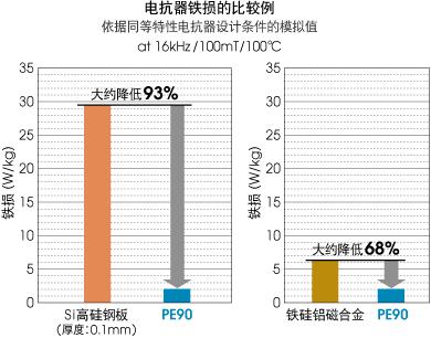 在強化這兩種材料的優勢性,進行改良的工作中,我們敢于開拓 “以往的材料尚未達到的領域”,挑戰磁特性,既大幅降低了磁芯損耗水平,又進一步提高了飽和磁通密度。